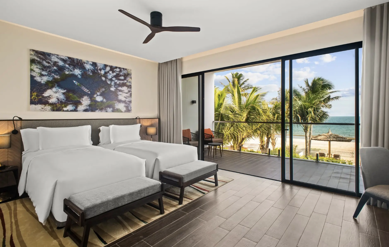 Diện tích khoảng 246m2, view hướng biển, hạng phòng gồm 01 giường đôi, 01 phòng tắm có buồng tắm đứng vòi hoa sen, bồn tắm, bồn Jacuzzi.