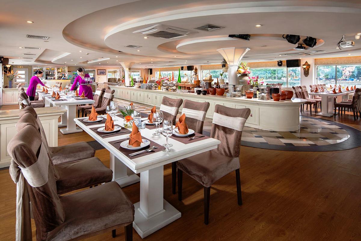 Du thuyền sở hữu hai nhà hàng riêng biệt với thiết kế "sang chảnh", tinh tế, phục vụ những thực đơn cao cấp được chế biến từ nguyên liệu tươi ngon nhất. Từ các set menu được bài trí tinh xảo đến các bữa tiệc buffet hoành tráng, mỗi bữa ăn đều là một tác phẩm nghệ thuật hội tụ tinh hoa ẩm thực Việt và quốc tế.