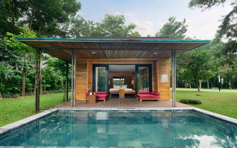 Diện tích khoảng 400 m²: 2 phòng ngủ & phòng khách lớn, bể bơi riêng ngoài, phù hợp gia đình.