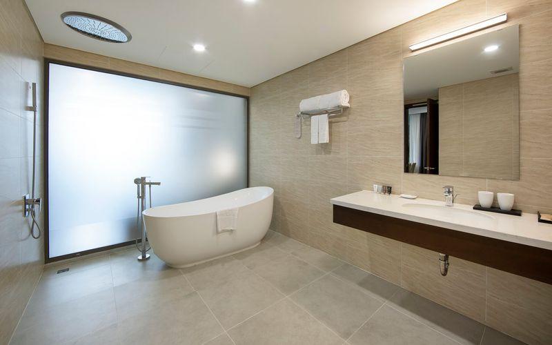 Diện tích khoảng 75 m²: 1 phòng ngủ & phòng khách rộng, giường đôi/đơn, ban công toàn cảnh, bồn tắm + vòi sen.