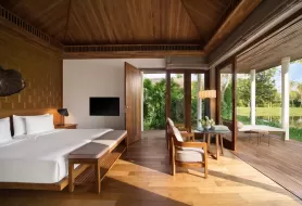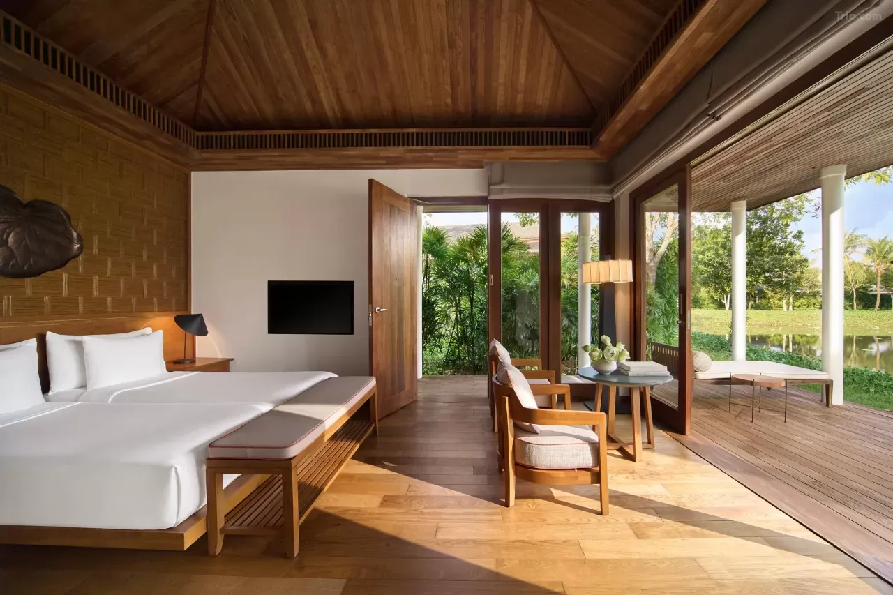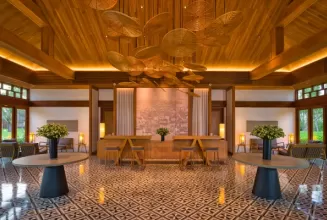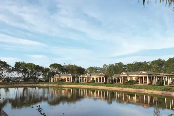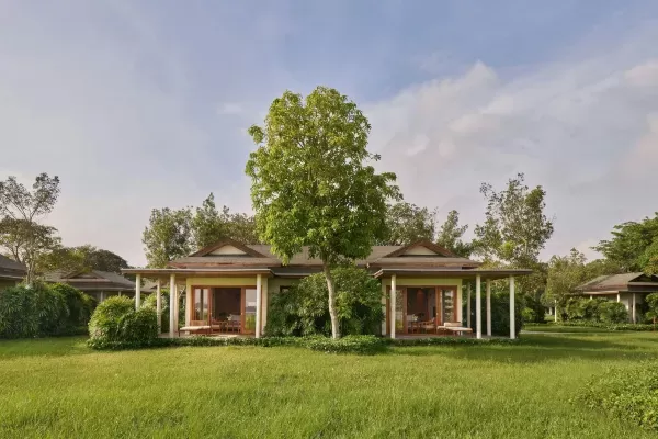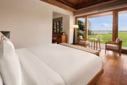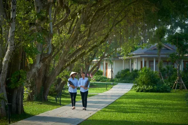 Resort rộng khoảng 8ha, thiết kế lấy cảm hứng từ kiến trúc truyền thống và được thể hiện theo kiểu đương đại, hướng nhìn đẹp ra mặt sông, hồ và đặc biệt bảo tồn nguyên vẹn những gốc cây cổ thụ gần trăm năm trong quá trình xây dựng. Vì vậy, resort được xem là điểm “Di sản Xanh” lý tưởng để nghỉ dưỡng.
