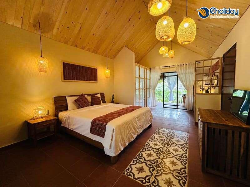 Diện tích khoảng 45–50m², thiết kế dạng bungalow độc lập, gần gũi với thiên nhiên. Phòng gồm 1 phòng ngủ với 1 giường đôi lớn, không gian mở, trần cao tạo cảm giác rộng rãi. Bungalow thường có hiên hoặc sân nhỏ phía trước, view hướng vườn, cây xanh hoặc hồ cảnh quan.