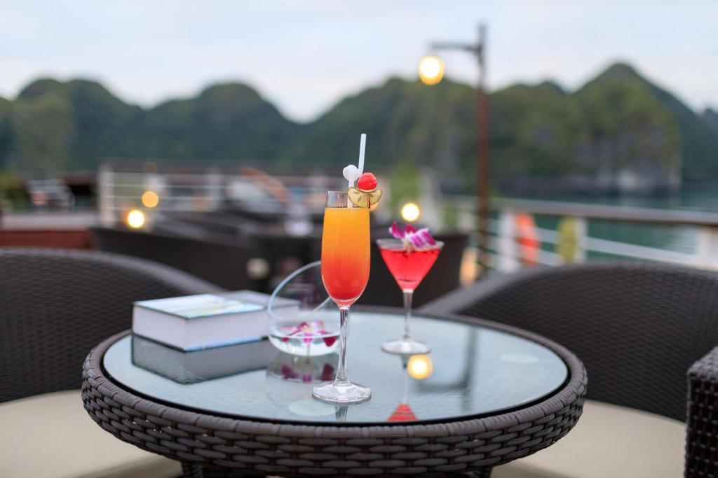 18:00 Trở về du thuyền, quý khách thư giãn trên sân thượng, săn hoàng hôn, thưởng thức đồ uống cùng chương trình Giờ hạnh phúc (mua 1 tặng 1) hoặc vui vẻ cùng lớp nấu ăn.