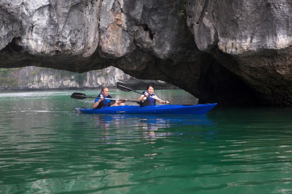 Hoạt Động Khám Phá Hấp Dẫn: Chèo thuyền kayak khám phá các hang động nhỏ và làng chài, tham quan các hang động nổi tiếng (như Hang Sửng Sốt, Hang Luồn), bơi lội ở vùng nước trong xanh của Vịnh Lan Hạ, tham gia lớp học nấu ăn, trải nghiệm câu mực đêm, và tập Thái Cực Quyền (Tai Chi) buổi sáng trên boong tàu.