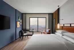 Diện tích diện tích khoảng 74 m², gồm phòng ngủ chính và khu phòng khách riêng biệt. Phòng được trang bị giường đôi king và cửa sổ lớn nhìn ra cảnh thành phố/núi, phòng tắm hiện đại với bồn tắm và buồng tắm đứng.