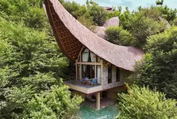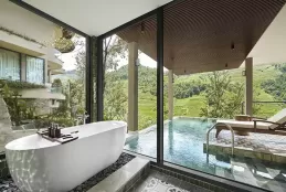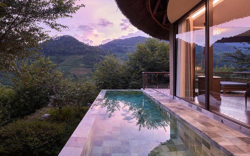 Hạng Wellbeing Pool Suite rộng khoảng 65 m² với hồ bơi riêng và tầm nhìn núi – ruộng bậc thang.