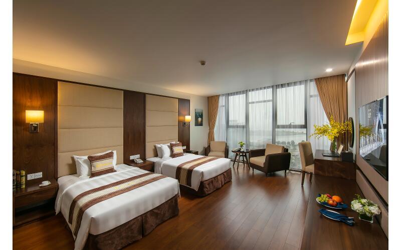 Diện tích ~36 m² với 2 giường đơn, trang bị đầy đủ tiện nghi như wifi miễn phí, TV LED và phòng tắm riêng với bồn tắm hoặc buồng tắm đứng; thiết kế thoáng với cửa kính lớn giúp ngắm cảnh thành phố.