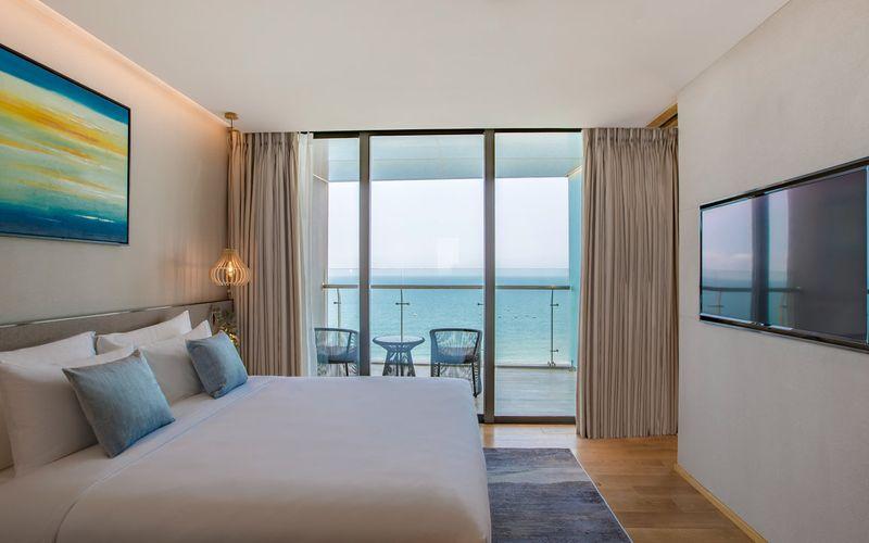 Thư giãn với tầm nhìn trực diện ra bãi biển không bị che khuất và ánh sáng tự nhiên tràn ngập từ ban công riêng đón gió biển. Không gian được trang trí với gam màu dịu nhẹ, mang đến cảm giác thư thái tuyệt đối