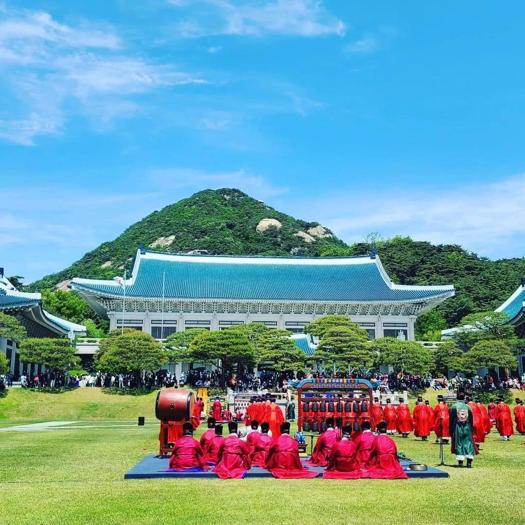 Tham quan khuân viên Nhà Xanh (The Blue House) –Phủ Tổng Thống- nơi làm việc và nơi ở chính thức của các đời Tổng Thống Hàn Quốc. Nhà Xanh được xây dựng trên một khuôn viên rộng lớn với kiến trúc truyền thống Hàn Quốc kết hợp yếu tố hiện đại. (Chụp ảnh bên ngoài Nhà Xanh)